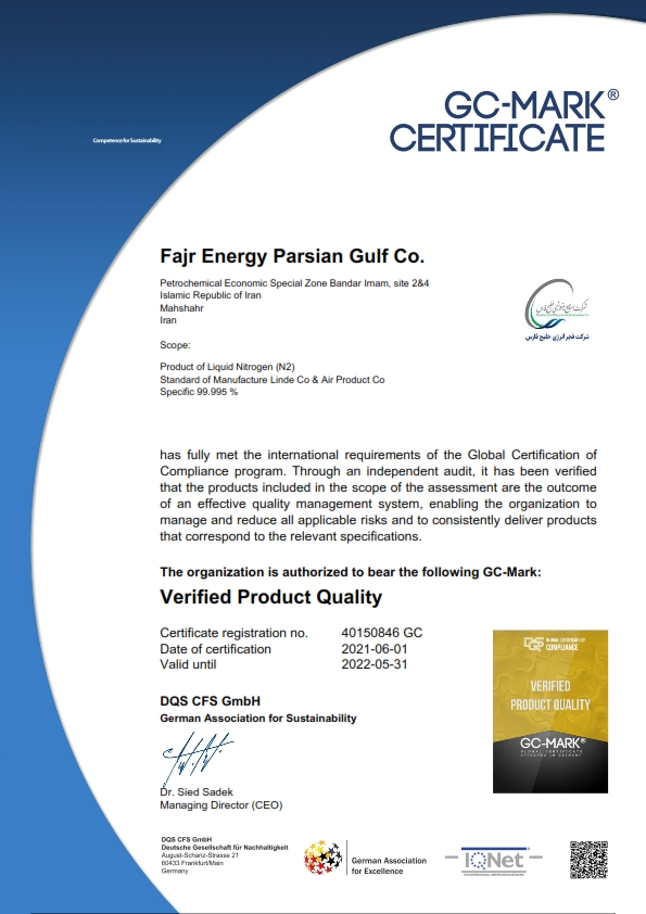 إحدى الشهادات التي تحصل عليها شركة فجر الخليج الفارسي للطاقة لمنتجاتها السائلة